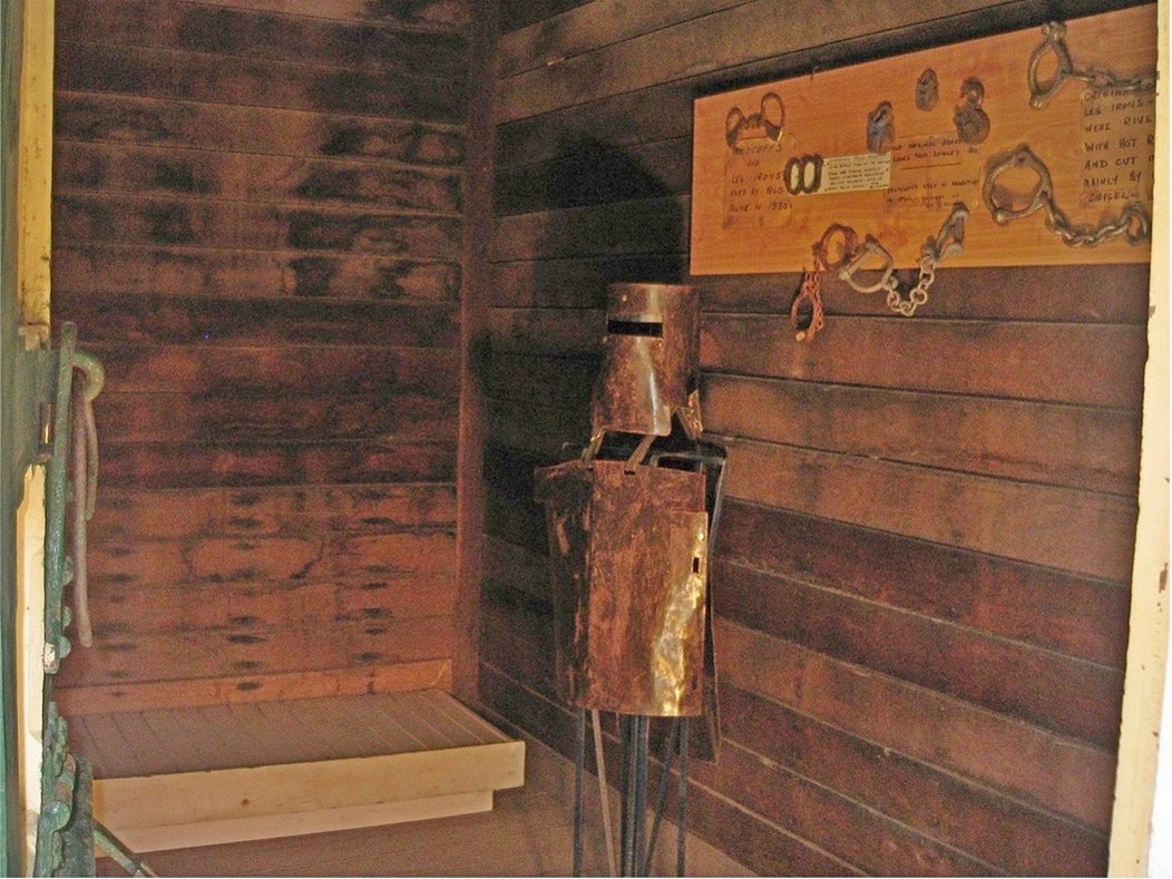 Wooden bed, Assorted handcuffs, Leg irons, and an imitation set of Ned Kelly's armour.